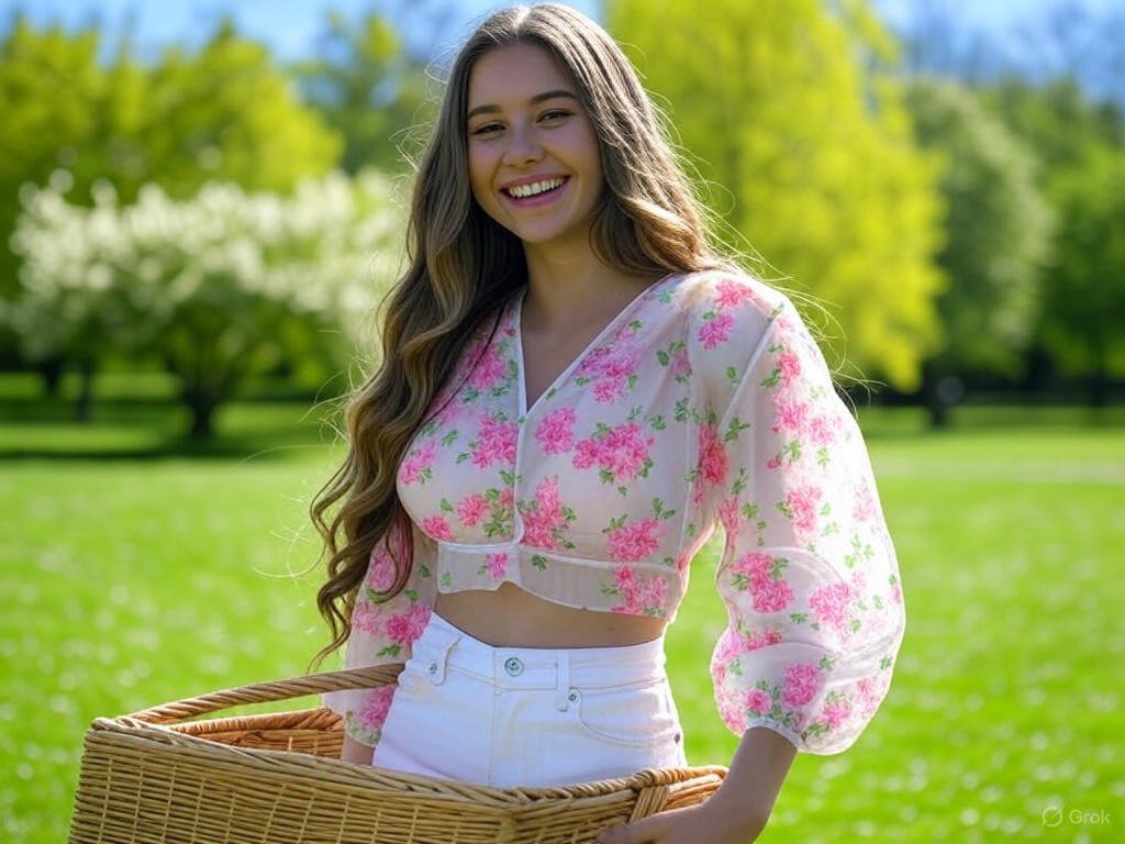 Portret młodej kobiety o słowiańskiej urodzie, z długimi falowanymi włosami, ubranej w bluzkę z organzy z pastelowym nadrukiem kwiatów na białym tle, która delikatnie odsłania biustonosz w odcieniu pudrowego różu. Kobieta stoi na tle zielonego parku w Londynie, trzymając w ręku koszyk piknikowy. Obok niej stoją białe szorty. Atmosfera jest radosna i pełna energii, typowa dla wiosennego dnia.