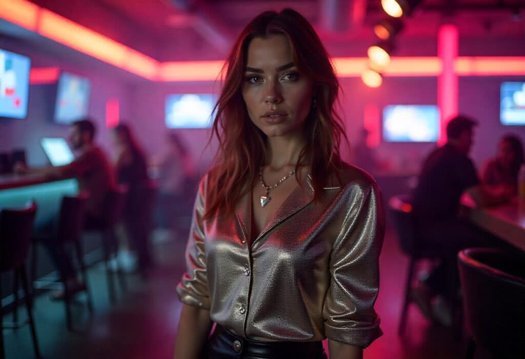 Portret młodej, pewnej siebie kobiety o słowiańskiej urodzie, ubranej w koszulę flanelową z metalicznymi nićmi w odcieniach srebra i złota, połączoną z czarnymi lateksowymi spodniami. Kobieta ma na sobie geometryczną biżuterię ze stali nierdzewnej oraz srebrne szpilki. Tło przedstawia futurystyczną imprezę w Los Angeles, z kolorowymi światłami i nowoczesnym designem.