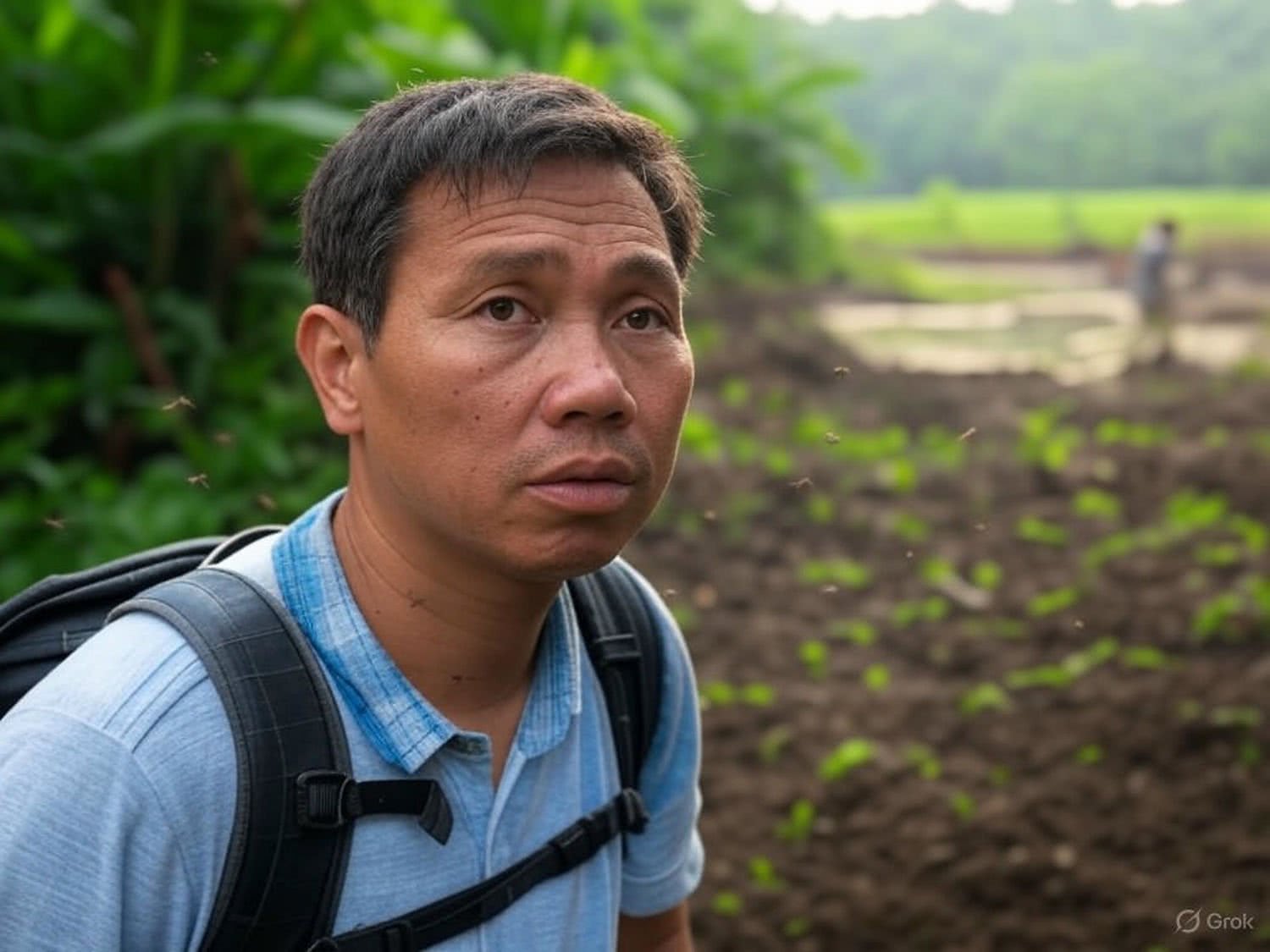 Generuj realistyczną ilustrację przedstawiającą turystę w tropikalnej dżungli Azji Południowo-Wschodniej, otoczonego komarami przenoszącymi choroby jak malaria lub denga, z elementami braku infrastruktury sanitarnej w tle (np. brudna woda, gęste zarośla), podczas gdy w oddali widać miejscowego mieszkańca spokojnie pracującego w codziennym otoczeniu, symbolizując wyższe ryzyko dla turystów w porównaniu do odporności mieszkańców, w stylu edukacyjnym i informacyjnym. Użyj ciepłych, wilgotnych tonów zieleni i brązów, aby oddać klimat Azji i Chin.