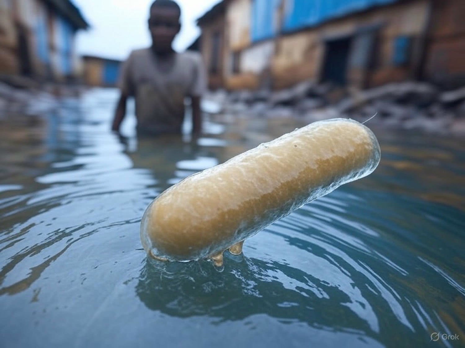 Generuj ilustrację edukacyjną przedstawiającą bakterię Vibrio cholerae w skażonej wodzie, z osobą cierpiącą na objawy odwodnienia i biegunki w slumsowym środowisku, podkreślając transmisję drogą fekalno-oralną, z elementami globalnego ryzyka jak dostęp do czystej wody. Styl realistyczny, informacyjny, bez graficznych szczegółów. kolory dominujące: niebieski i brązowy.