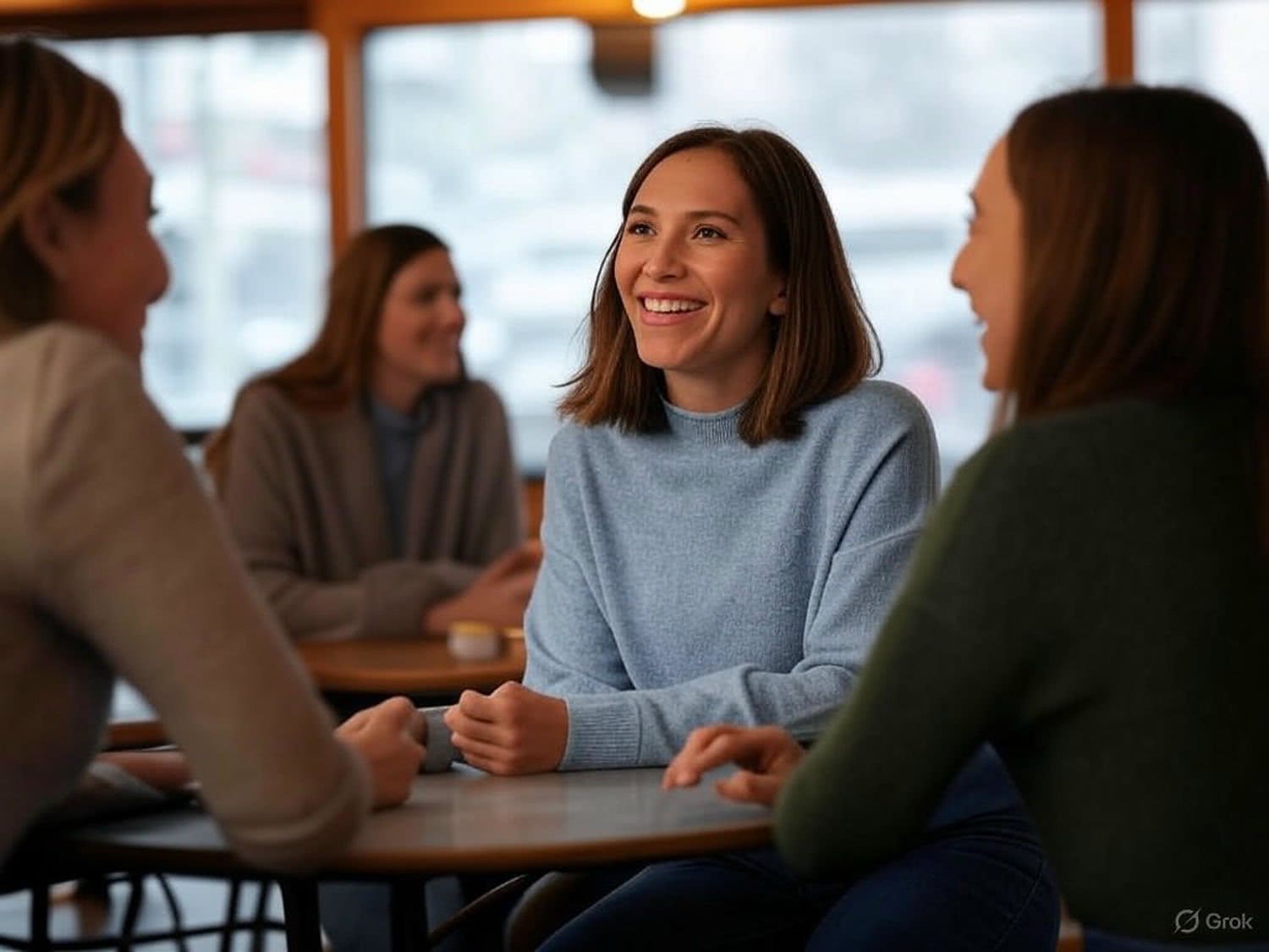 Ilustracja przedstawiająca uśmiechniętą kobietę siedzącą w przytulnej kawiarni z dwiema przyjaciółkami, rozmawiającą z entuzjazmem, symbolizującą pewność siebie i pozytywne zmiany w życiu codziennym, w bezpiecznym i neutralnym otoczeniu, z ciepłymi kolorami i spokojną atmosferą.