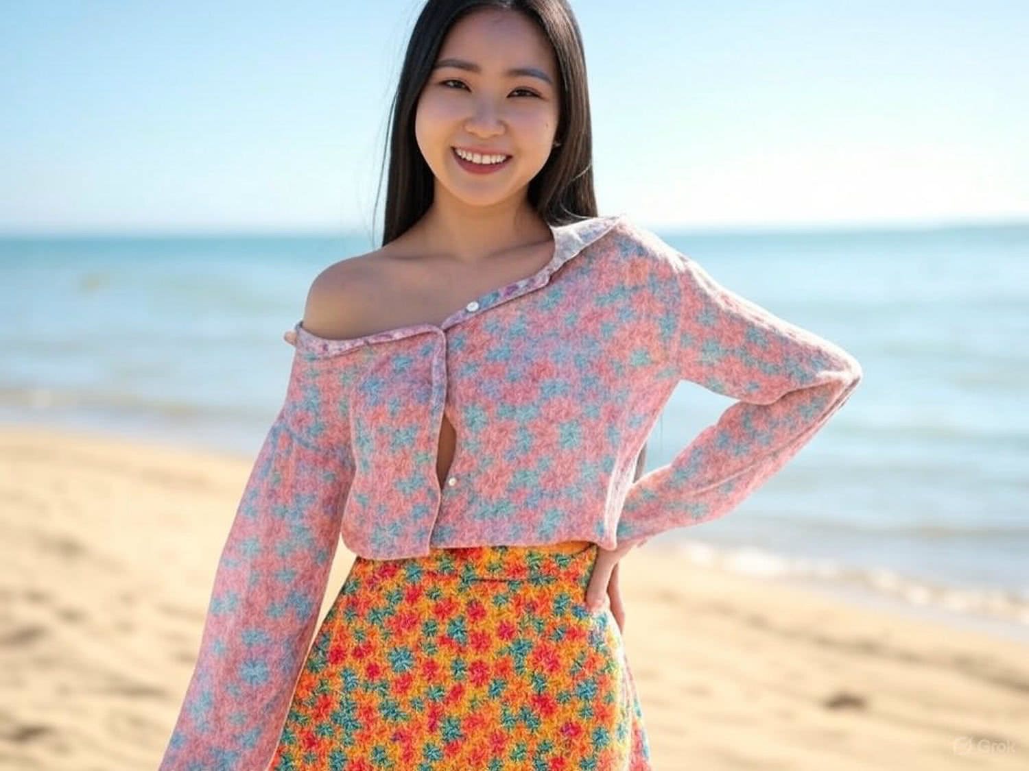 Modern air brush illustration: of a young Asian woman in her mid-30s with long, black hair, standing confidently on a sunny beach. She wears a vibrant floral-patterned mini skirt and a semi-transparent, oversized blouse with open buttons, slightly revealing her bust. The blouse is off one shoulder, enhancing her joyful expression. The background features a calm sea and golden sand, with a clear blue sky above. The scene is set during a bright summer day, emphasizing a light and energetic atmosphere without any distracting elements. The focus is primarily on her face and attire, with the beach setting providing a serene yet vibrant backdrop. IMAGE STYLE: vibrant colors, depth of field, focus on person