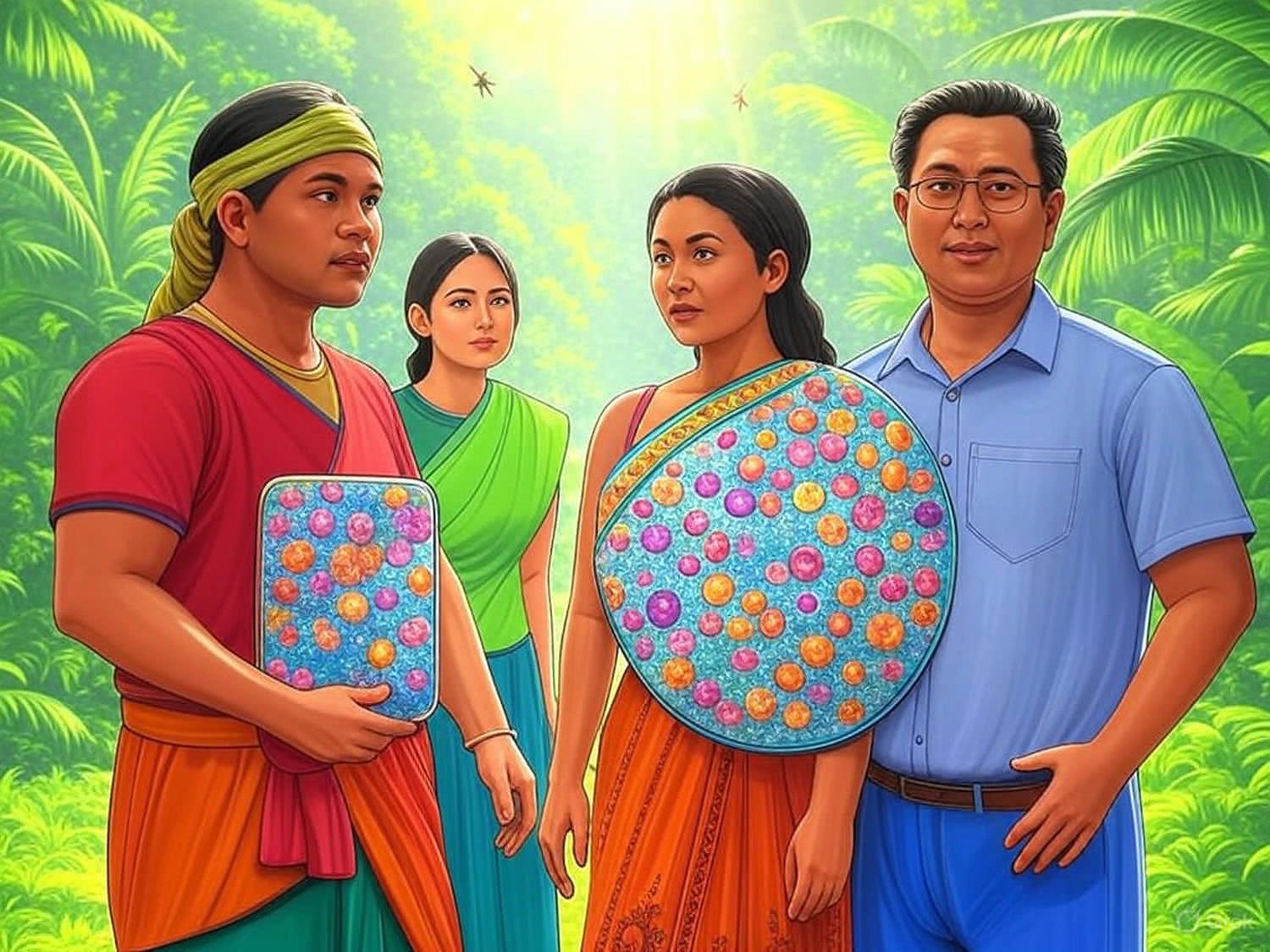 Modern air brush illustration: A high-resolution, colorful illustration of a South Asian and a Chinese local in a lush tropical jungle, both equipped with a visible shield of acquired immunity represented by immunological cells and antibodies. The locals are dressed in traditional attire, appearing healthy and alert. Nearby, a tourist without protection looks slightly concerned. The background features dense jungle foliage and a few mosquitoes, with bright sunlight filtering through the trees to create a vibrant and educational scene. The composition uses contrast to highlight the difference in susceptibility between the locals and the tourist, maintaining a focused and engaging visual without unnecessary distractions. IMAGE STYLE: mostly warm colors (representing heat, heat, tropics, high temperature), vivid colors, depth of field, focus on person,