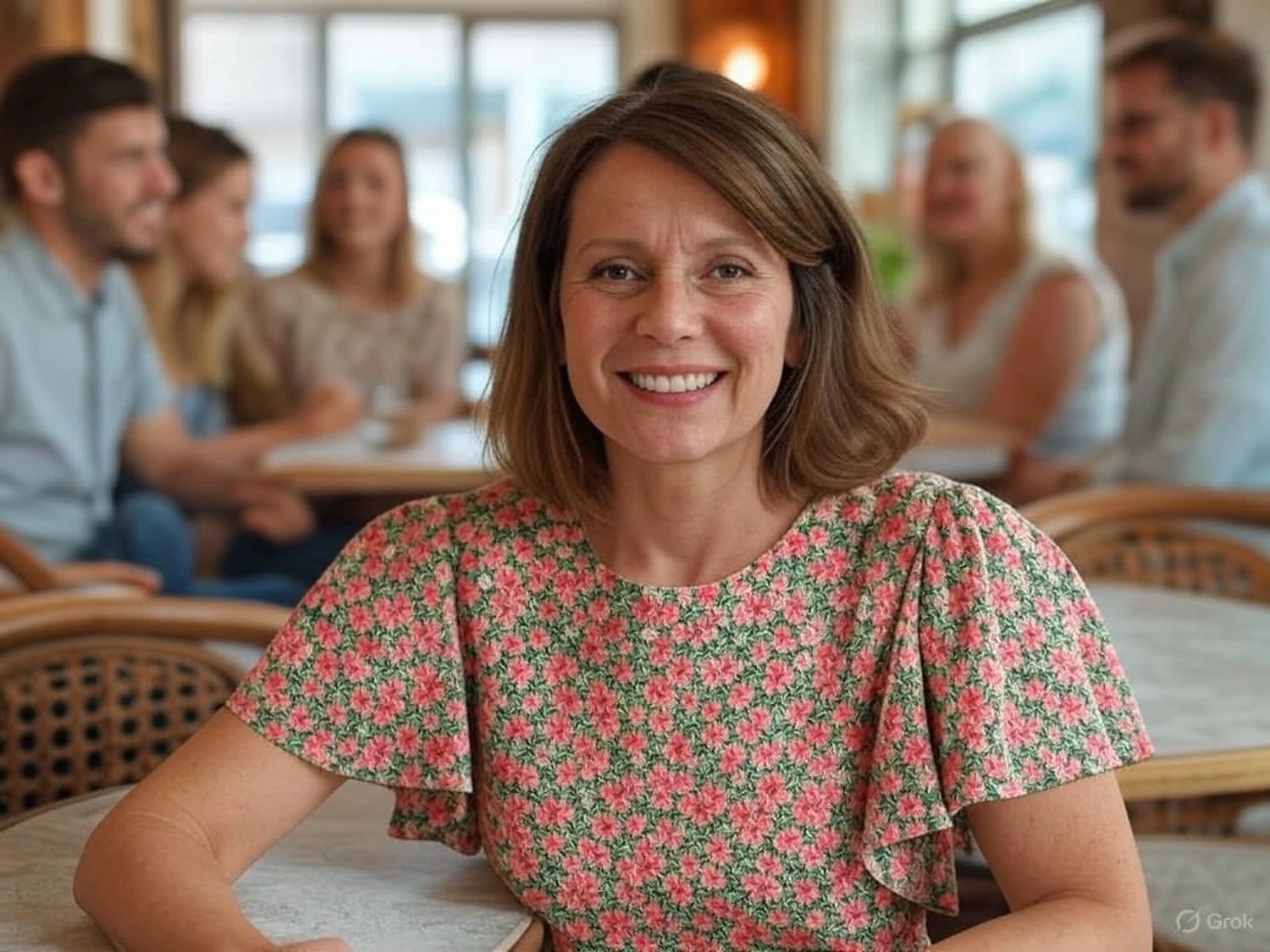 Ilustracja: Uśmiechnięta kobieta w otoczeniu przyjaciółek w przytulnej kawiarni, symbolizująca empowermment, pewność siebie i pozytywne zmiany w życiu, w stylu artystycznym z ciepłymi kolorami, bezpieczna dla wszystkich widzów.