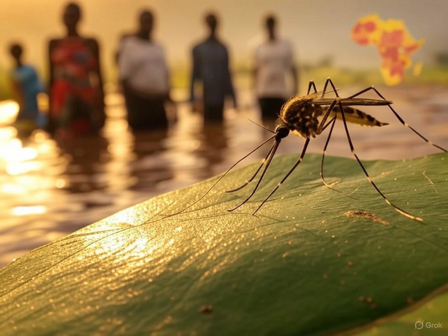 Generuj ilustrację przedstawiającą wpływ zmian klimatycznych i migracji na rozprzestrzenianie patogenów w Afryce: pokaż komary jako wektory chorób tropikalnych, takich jak malaria, w krajobrazie z rosnącymi temperaturami, powodziami i zastojami wody; włącz elementy migracji, jak turyści i migranci narażeni na komary, w porównaniu z odpornymi mieszkańcami; użyj mapy Afryki w tle, z ciepłymi kolorami symbolizującymi ocieplenie, aby podkreślić globalne zagrożenie zdrowotne. Styl: informacyjny i realistyczny.