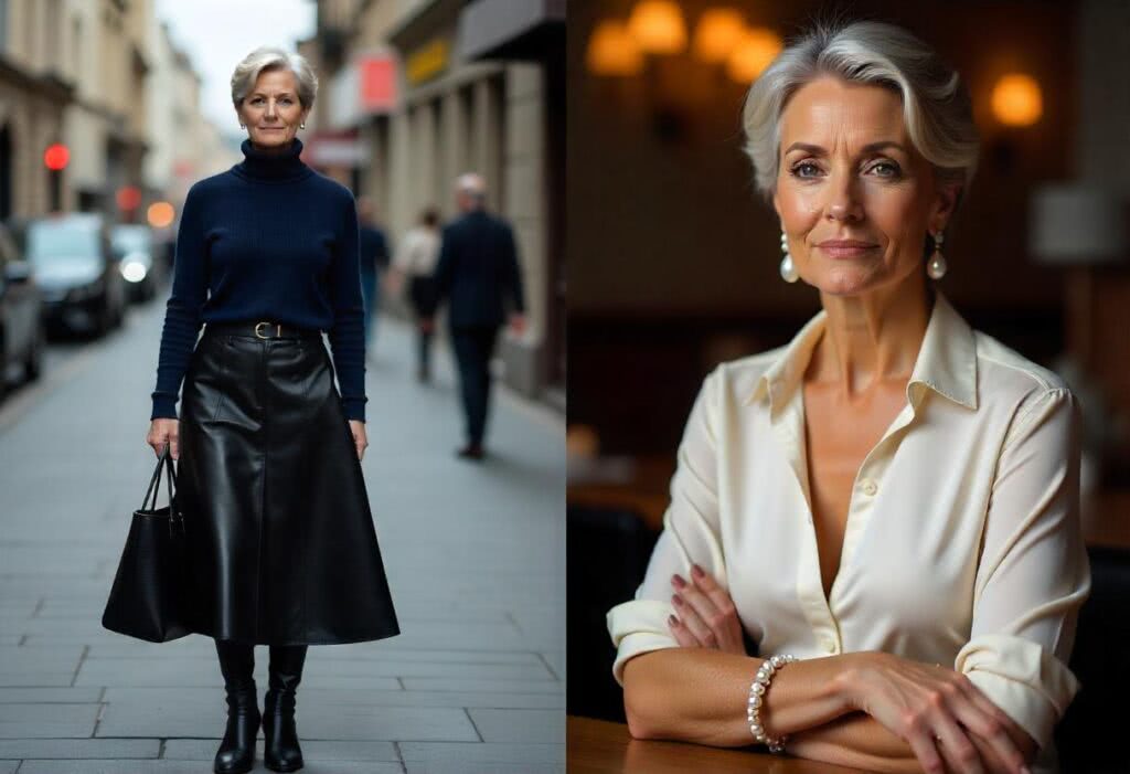 Skórzana spódnica midi z jedwabną bluzką na wieczorne spotkanie – Szykowna elegancja dla dojrzałej damy