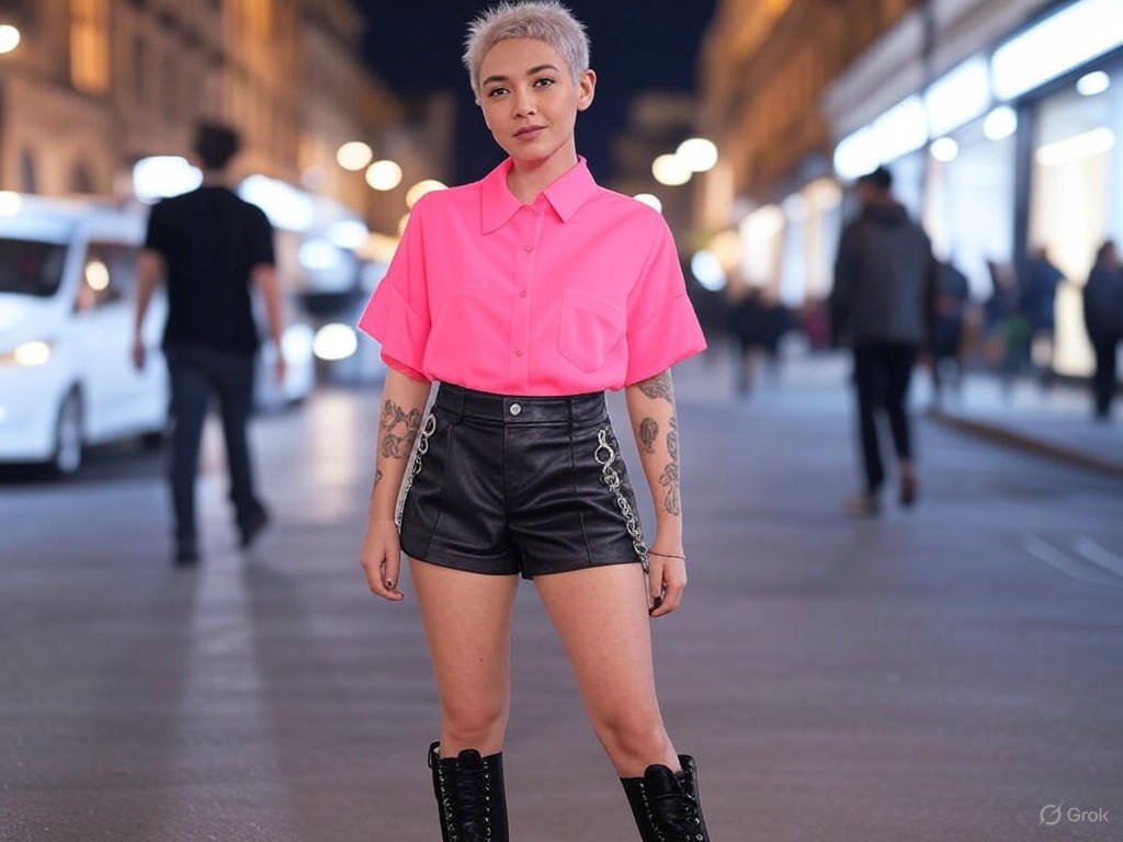 Wyobraź sobie, że jesteś na ulicach wielkiego miasta, a wśród tłumu dostrzegasz kobietę, która przyciąga wzrok jak magnes. Jej neonowa bluzka wręcz pulsuje energią, a czarne szorty z łańcuchami dodają jej wyrazistości. Na nogach ma klasyczne martensy, które nadają całości charakteru i buntu. To nie jest zwykły look – to manifest kobiety, która wie, czego chce i nie boi się tego pokazać.