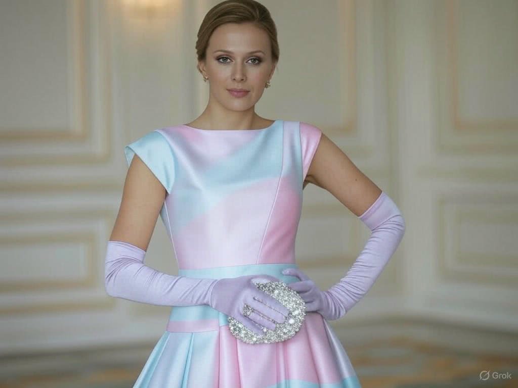 Elegancka kobieta o słowiańskiej urodzie, w wieku około 30-40 lat, z delikatną figurą i jasną cerą, ubrana w sukienkę koktajlową w pastelowym kolorze. Na rękach ma satynowe krótkie rękawiczki w podobnym odcieniu, a w dłoni trzyma małą torebkę kopertówkę zdobioną kryształkami, również w harmonizującym kolorze. Kobieta stoi na tle eleganckiego wnętrza, emanując pewnością siebie i wyrafinowaniem.