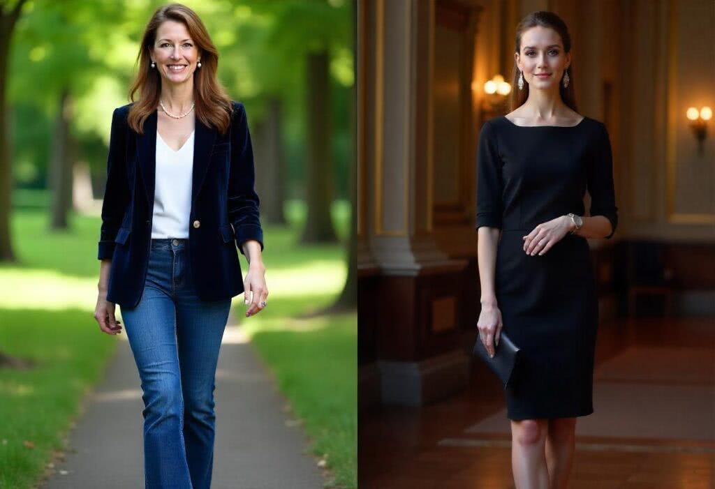 A high-resolution photograph of a 50-year-old woman with long, chestnut hair and sparkling eyes, wearing a navy velvet blazer, standing in a park. She is dressed in bootcut jeans, a white cotton shirt, nude ballet flats, and a delicate pearl necklace. The background features lush greenery with soft, natural lighting, focusing on her face and upper body. In a separate setting, she is inside an elegant opera house, wearing a black knee-length dress with a boat neckline, black heels, a navy clutch, and silver hanging earrings and bracelet. Her makeup is subtle with smoky eyes and nude lips. The opera house background is softly lit with ornate decor, maintaining focus on her without distractions. The overall composition emphasizes her elegance and the serene, elegant environments.
