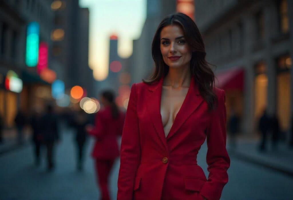 Portret pewnej siebie brunetki w czerwonym garniturze z dekoltem w serek, stojącej na tle miejskiego krajobrazu wieczorem. Kobieta ma smukłą sylwetkę, błyszczące oczy i eleganckie czarne szpilki oraz małą kopertówkę.