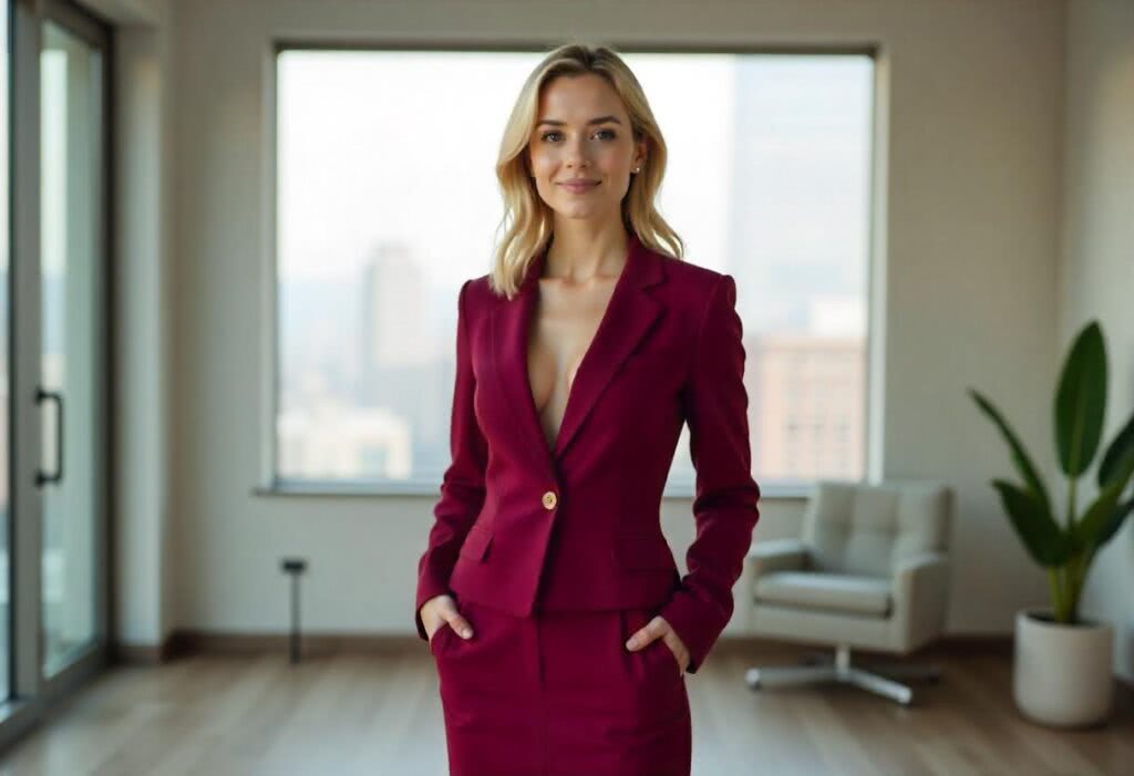 A high-resolution photograph of a young, slender woman with fair skin and shoulder-length blonde hair, wearing a fitted bordeaux-colored suit with a knee-length skirt and a cropped jacket ending at her waist. She stands confidently with a gentle smile, her hands in the jacket pockets. The background features an elegant office or conference room with soft, natural lighting and large windows showing a cityscape. The room includes subtle decor like modern art on the walls and possibly a potted plant, maintaining a focused and professional atmosphere without distracting from the main subject.