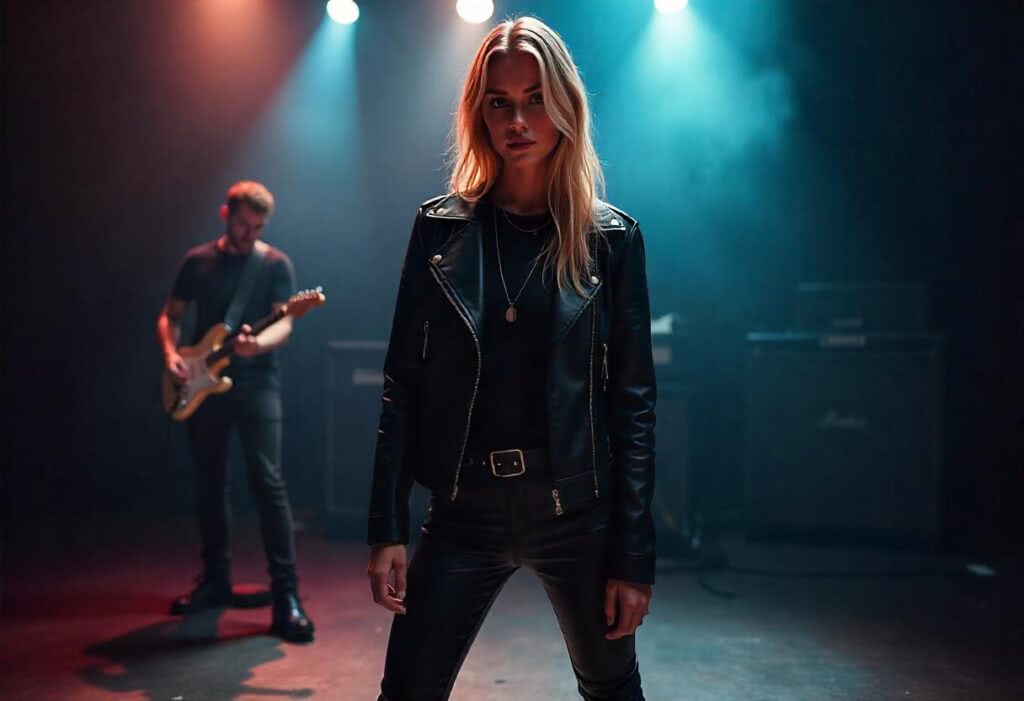 Młoda, szczupła kobieta o słowiańskiej urodzie z długimi blond włosami, ubrana w czarne legginsy z eko-skóry, które idealnie opinają jej nogi. Kobieta nosi oversize’owy T-shirt w ciemnym kolorze oraz ciężkie buty combat. Na ramionach ma skórzaną kurtkę typu ramoneska. W tle widoczne są elementy rockowej sceny, takie jak gitara elektryczna i reflektory.