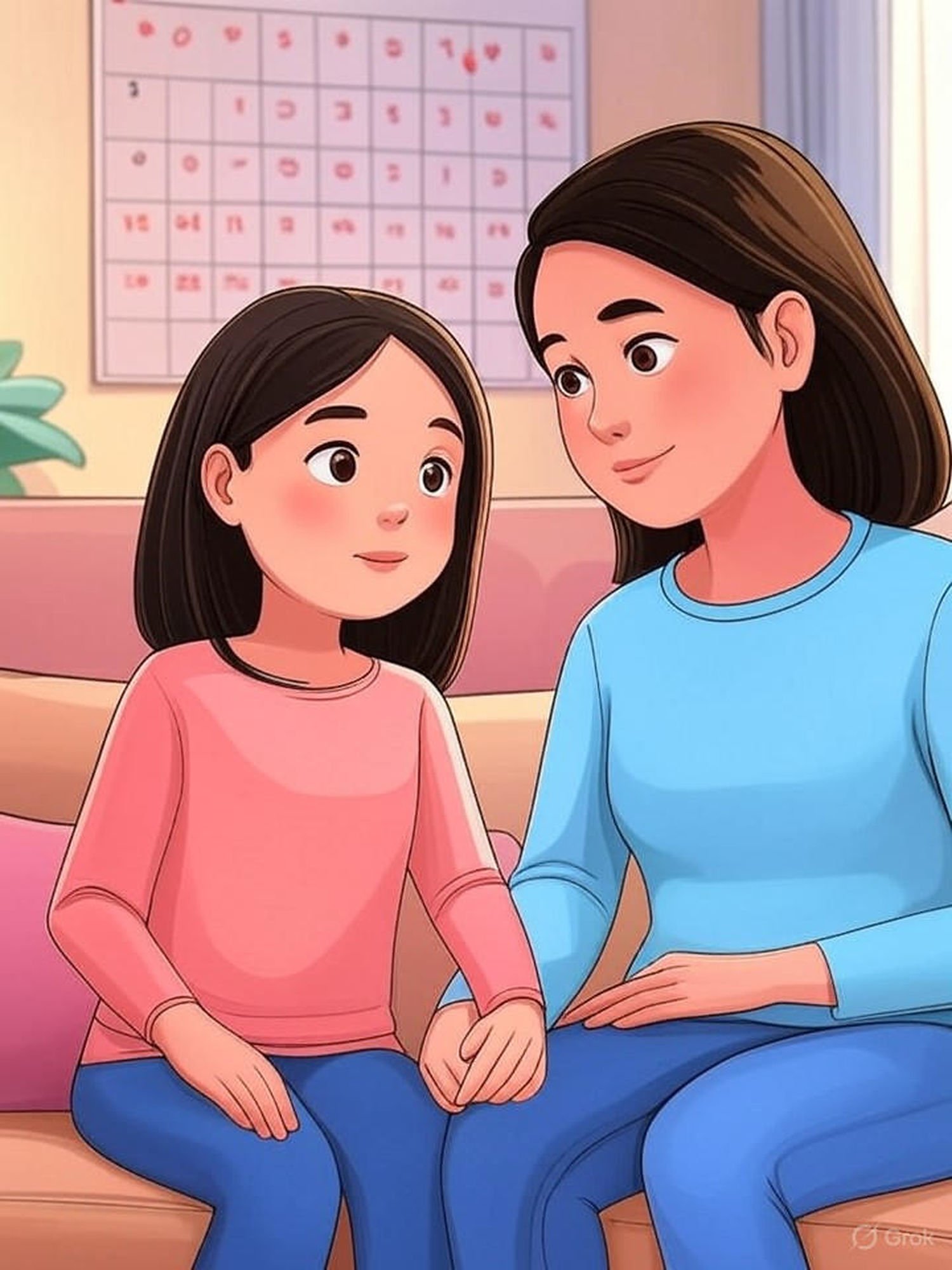 Semi-realistic medical illustration in an infographic style, safe for all audiences, without nudity: A high-resolution, cartoon-style illustration of a young teenager and her caring mother seated on a sofa in a cozy living room. The mother has a gentle, supportive expression, and the teenager appears curious. In the background, there is a calendar on the wall with marked dates and subtle icons like small droplets of blood and hearts, symbolizing menstruation and health. The room is decorated in warm, soothing colors, with soft natural light entering through a window. The overall composition focuses on the interaction between the mother and daughter, emphasizing empathy, knowledge, and support in a safe, educational context. The image is in a vertical format, suitable for educational material aimed at teenagers. IMAGE STYLE: Safe for all audiences, without nudity. Use a warm color palette of deep orange, deep purple, deep red, grays, and a touch of pink for a woman feel. The background should be blurred and minimalistic. The mood should be gentle, warm, friendly, aimed at women.
