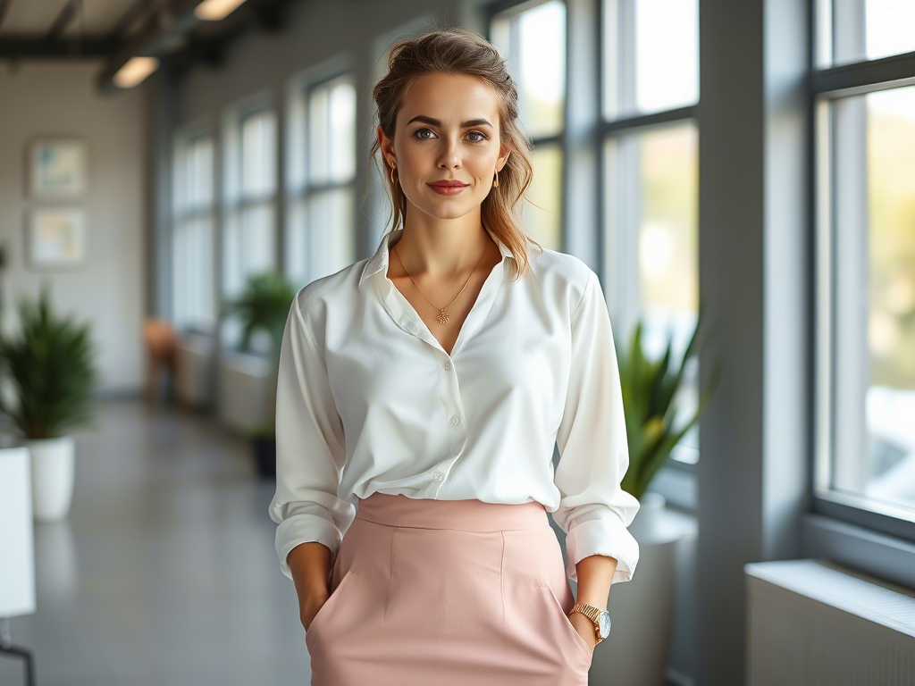 A high-resolution photograph of a young, confident woman in her mid-30s with Slavic features, wearing a pastel pink pencil skirt, a white blouse with rolled-up sleeves, and beige ballet flats. She has a delicate necklace, small gold earrings, and a simple watch with a bracelet. Her makeup is natural with light foundation, mascara, and a subtle lip gloss. Her hair is styled in a loose bun. The background shows a summer day in a modern office setting with large windows, providing soft natural light. The office environment is calm and uncluttered, focusing primarily on the woman. The overall mood is professional yet approachable, set in a realistic, inviting space.