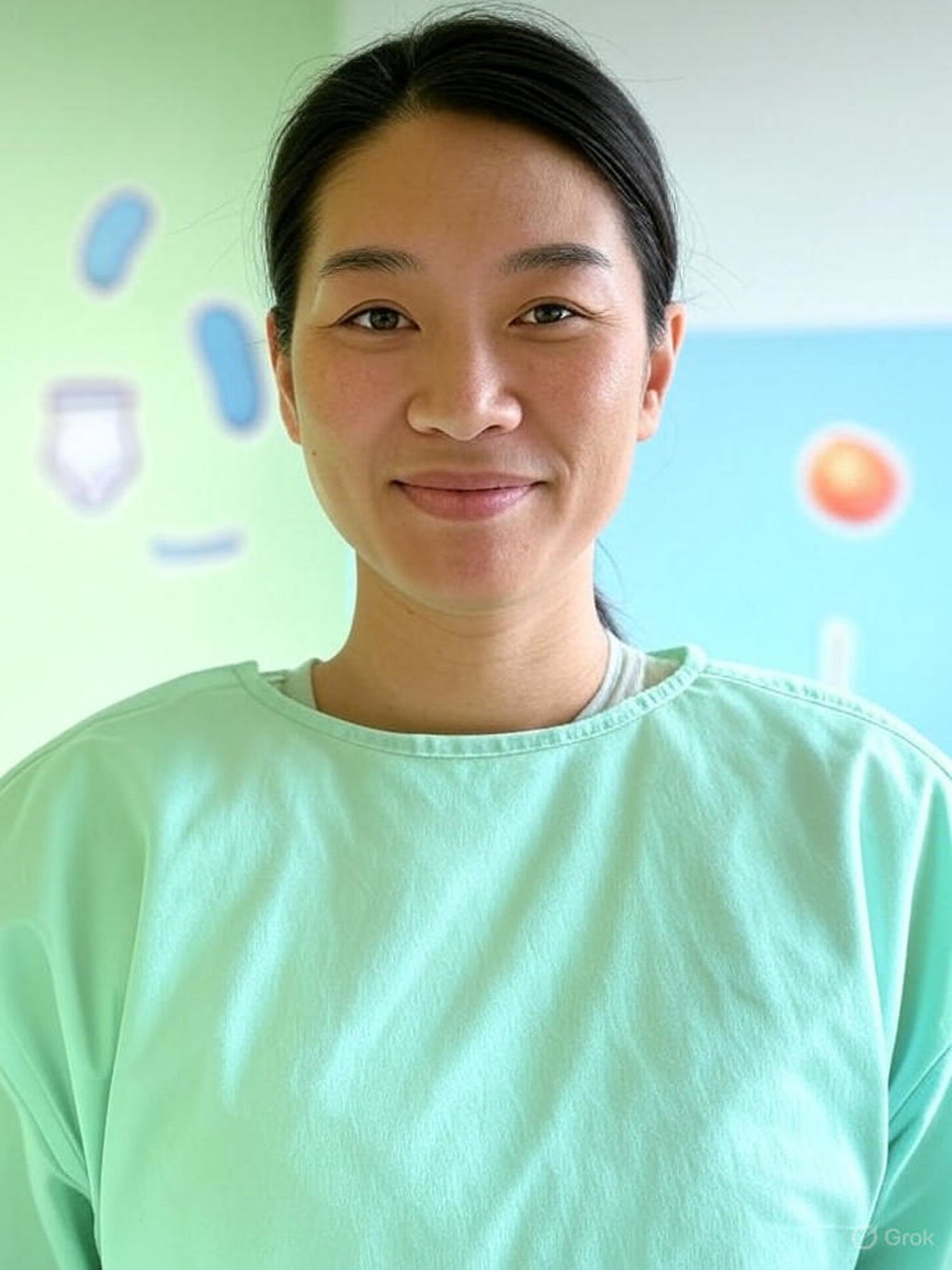 Semi-realistic medical illustration in an infographic style, safe for all audiences, without nudity: of a woman with a gentle, reassuring expression, wearing a light green medical gown, in a softly lit room with pastel green and blue walls. The background subtly features Lactobacillus bacteria and symbols of a healthy lifestyle, such as cotton underwear, a piece of fruit, and a toothbrush, without overwhelming the main subject. The woman’s hair is neatly styled, and her skin has a healthy glow. The overall composition focuses on her, with soft natural lighting creating a calm and educational atmosphere, emphasizing vaginal health and bacterial balance in a non-graphic, friendly manner. IMAGE STYLE: Safe for all audiences, without nudity. Use a warm color palette of deep orange, deep purple, deep red, grays, and a touch of pink for a woman feel. The background should be blurred and minimalistic. The mood should be gentle, warm, friendly, aimed at women.