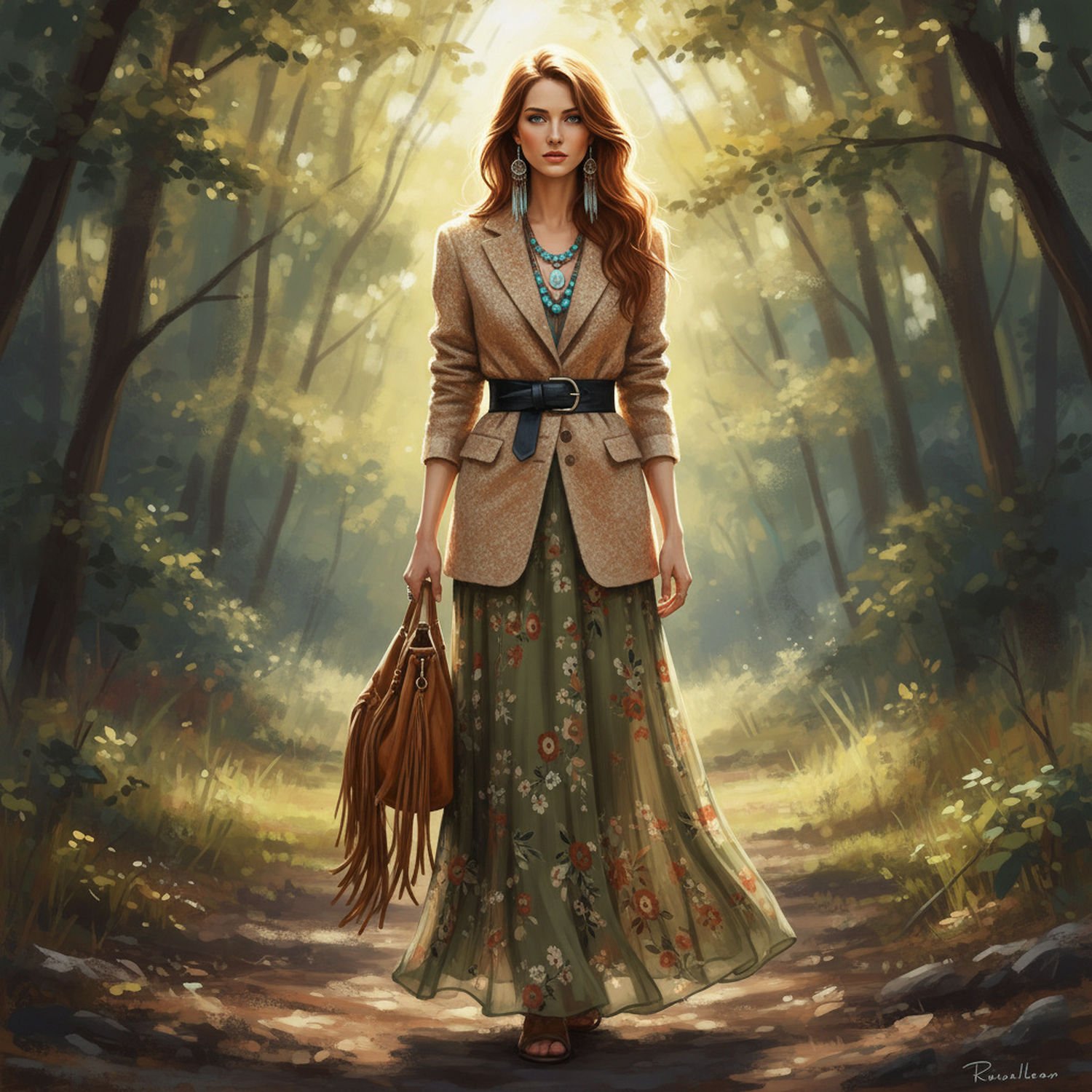Modern air brush illustration: A modern woman standing confidently in a boho-chic outfit, wearing a heavy woolen blazer in beige cinched at the waist with a wide black leather belt that accentuates her hourglass figure, paired with a long flowing maxi skirt in earthy olive green chiffon that reaches her ankles and moves gently, layered with subtle floral prints; she has long wavy hair, wearing dangling fringe earrings, a turquoise necklace, and holding a fringed bag, posed in a natural outdoor setting with soft sunlight filtering through trees. IMAGE STYLE: vibrant colors, depth of field, focus on person