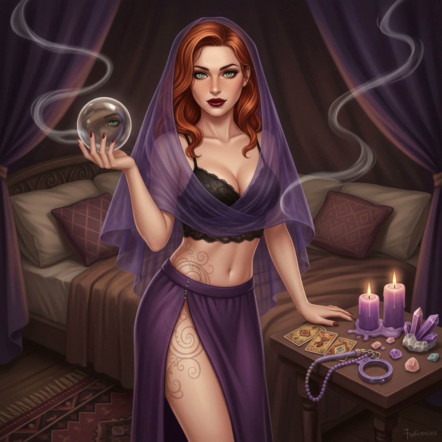 Modern air brush illustration: A professional illustration of a confident Scottish woman in her thirties, named Fiona, embodying an enigmatic fortune teller in a transformed bedroom setting. She has shoulder-length wavy reddish hair glowing like autumn leaves in candlelight, emerald-green eyes sparkling with mystery, smooth lightly tanned skin dotted with subtle freckles on her face and flat chest, full lips painted in deep cherry lipstick, and delicate swirling tattoo patterns visible on her stomach and hips. She wears a loose deep purple tulle veil draping softly over her shoulders, a simple black lace top accentuating her figure, and a long ankle-length skirt with a high side slit revealing her hip tattoo. In one hand, she holds a crystal ball reflecting her hypnotic green eyes; nearby on a bedside table are spread tarot cards, flickering purple candles, and scattered amethysts and rose quartz crystals. A light purple suede whip and soft amulet handcuffs with beads rest teasingly on the bed. The bedroom evokes a mystical tent with heavy draped curtains, fringed rug on the floor, ethnic-patterned pillows, and warm sandalwood-scented ambiance from dim candle glow, creating an intimate, erotic, and playful atmosphere of sensuality and confidence. Render in a realistic digital art style with soft lighting, rich colors, and elegant composition. IMAGE STYLE: vibrant colors, depth of field, focus on person
